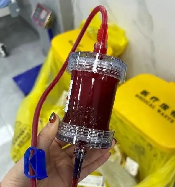 在回血的過程中她發現回血困難,有點手忙腳亂,最終與其他護理老師共同處理好管路并完成回血后,我們再次確認了卸除下的灌流器沒有凝血情況,灌流器內部吸附顆粒此時還是疏松的狀態,并沒有任何凝血結塊。