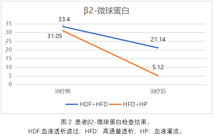 患者接受血液透析之后甲狀旁腺激素水平仍保持440 pg/mL,增加血液灌流之后甲狀旁腺激素水平降至113 pg/mL,接近人體正常水平(見圖1)。β2-微球蛋白在血液透析治療時從透析前的33.4 mg/L降至治療后21.14 mg/L。而在增加血液灌流治療之后,由治療前的31.05 mg/L降至5.12 mg/L,接近人體正常水平(見圖2)。由此可知,血液灌流可以提高中大分子毒素的清除率,緩解皮膚瘙癢癥狀。同時,由表2可知,增加血液灌流之后患者液體清除、營養狀況、鈣磷代謝和貧血情況均得到更好的改善。