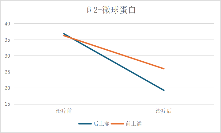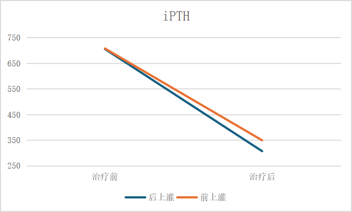 由于后上灌先進行2個小時的透析治療,血液經(jīng)過超濾,處于相對濃縮的狀態(tài),此時血液內中大分子毒素濃度相對較高。此時再行灌流治療,尿毒癥毒素會被灌流器的吸附顆粒大量吸附,從而提高灌流治療效果。如圖1和圖2,相對于前上灌,后上灌對中大分子毒素iPTH和β2-微球蛋白的清除效果更好。因此,后上灌更有利于清除中大分子毒素。