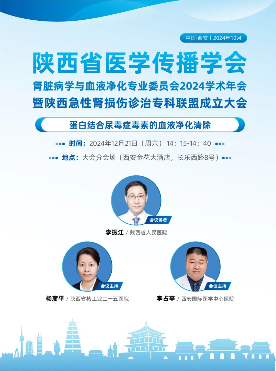 12月21日下午14:15-14:50在會(huì)議分會(huì)場(chǎng),陜西省人民醫(yī)院李振江教授將為大家主講《蛋白結(jié)合尿毒癥毒素的血液凈化清除》的專(zhuān)題報(bào)告,楊彥平教授和李占亭教授擔(dān)任此次主持。