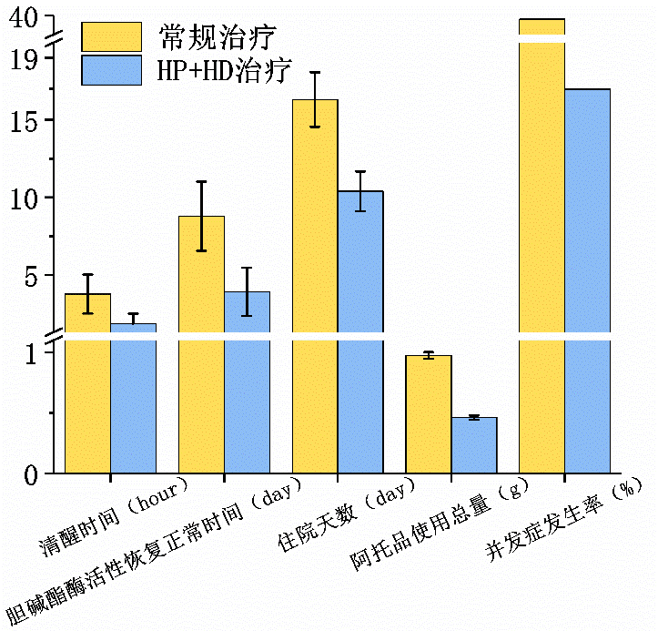 有機磷農藥是全球使用最為廣泛、用量最大的殺蟲劑之一。常見的有機磷農藥包括敵百蟲、敵敵畏、氧化樂果等,其揮發性強,在使用期間容易透過皮膚或經由呼吸道進入人體而誘發中毒。重度有機磷中毒具有并發癥多、病死率高、預后差的特點,故中毒后予以積極的救治成為促使患者轉危為安的重要保障。有機磷進入人體后會與膽堿酯酶結合,使得機體內聚集大量乙酰膽堿,造成交感、副交感神經等過度興奮,從而導致心肌細胞受損,而血液灌流聯合血液透析(HD)治療方案能促進患者病癥消退,縮短膽堿酯酶活性恢復時間,利于促進康復進程。[7]