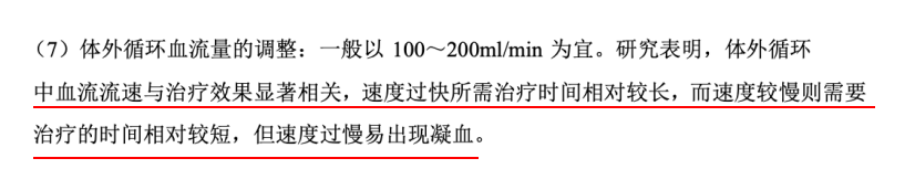 血液灌流治療時,血流量的設定直接關系到毒素清除的效果和體外循環的安全性。《血液凈化標準操作規程》(2021版)中明確指出血液灌流治療時,體外循環的血流量范圍為100-200ml/min。規程認為,如果血流速度過快,治療效果可能不佳,因此治療的時間會變長;而如果血流速度過慢,則有凝血的風險。因此推薦血流速度為100-200ml/min。